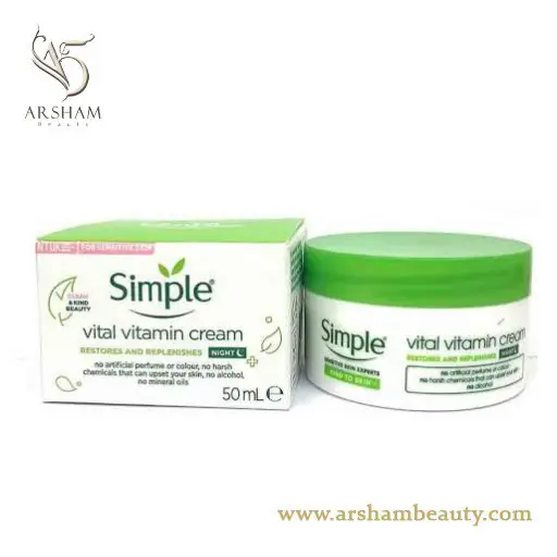کرم شب سیمپل Simple Vital Vitamin Night Cream یکی از بهترین محصولات مراقبت از پوست این برند است که با ترکیبات مغذی و آبرسان خود، پوست را در طول شب ترمیم و تقویت می‌کند. این کرم برای انواع پوست، به‌ویژه پوست‌های حساس، طراحی شده است و بافتی سبک و غیرچرب دارد.